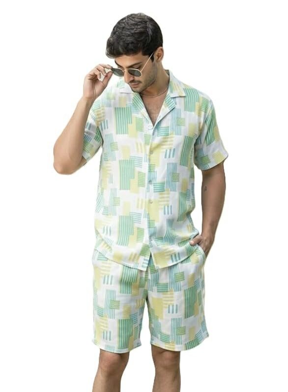 Men’s Printed Co-Ord Set | Plus Size Casual Shirt & Shorts Set | Nightwear Pajama Suit, Loungewear, Beachwear & Vacation Outfit Design No ME_NS Sky 07 Green Coconut