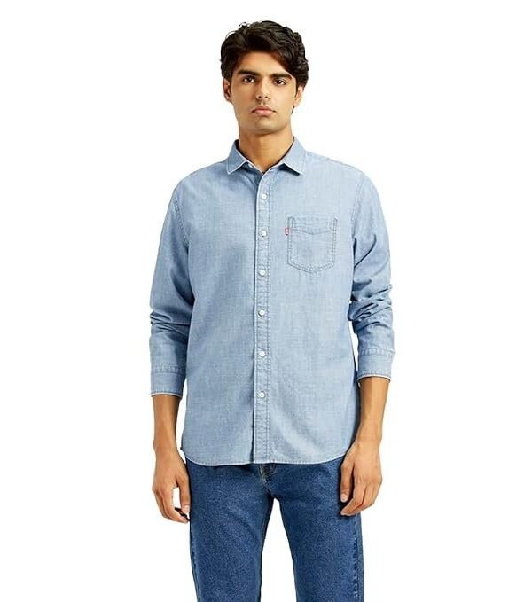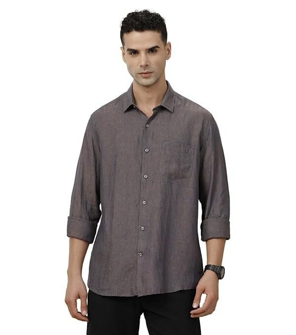 Linen Club Men's Pure Linen Blue Chambray Contemporary Fit Full Sleeve Casual Shirt