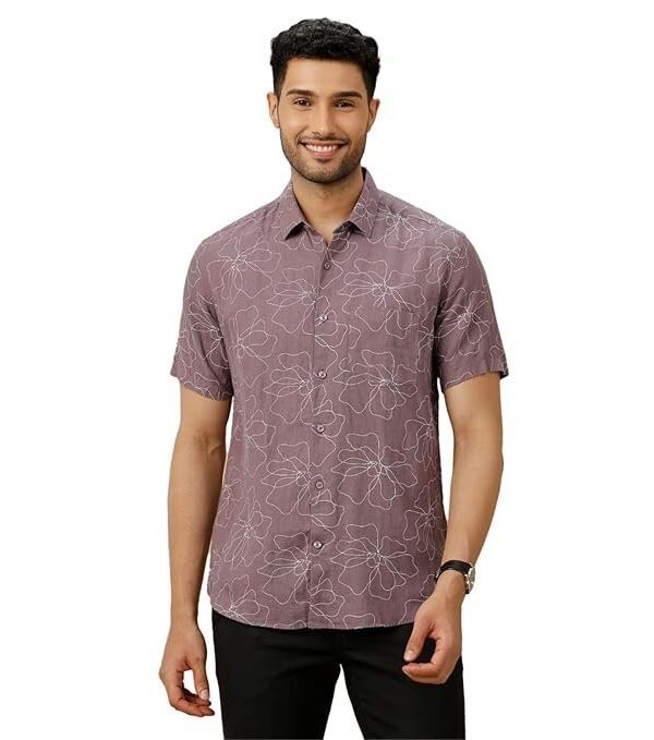 Linen Club Men's Pure Linen Purple Printed Contemporary Fit Half Sleeve Casual Shirt