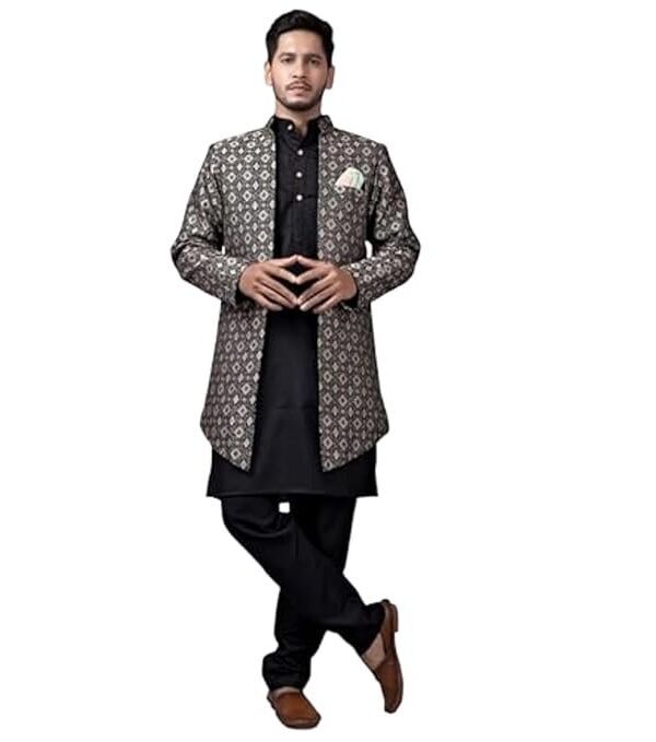 Amzira Men's Stylish Ethnic Wear Black Kurta Pajama Set with Long Jacket,