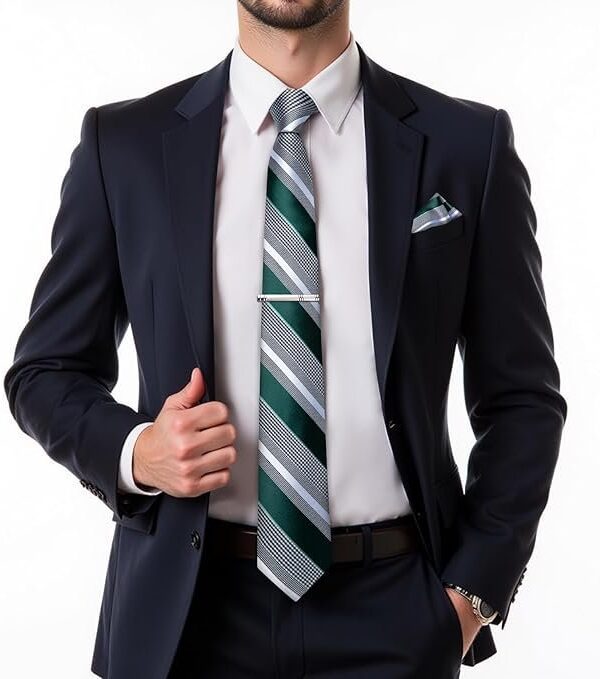DiBanGu Men's Emerald Green Grey Striped Tie Silk Woven Necktie Pocket Square Cufflink Set Formal